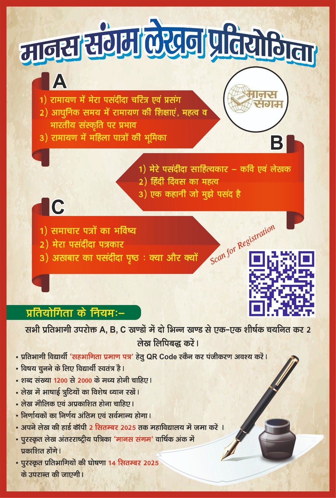 मानस संगम लेखन प्रतियोगिता 2025 साहित्यिक प्रतियोगिताएं November 16, 2025 Updated: November 16, 2025 By Admin Share FacebookTwitterWhatsAppEmailPrintTelegram 55 Adminhttp://manassangam.com Share FacebookTwitterWhatsAppEmailPrintTelegram LEAVE A REPLY Cancel reply Comment: Please enter your comment! Name:* Please enter your name here Email:* You have entered an incorrect email address! Please enter your email address here Website: Save my name, email, and website in this browser for the next time I comment. Advertisement Latest news संस्थान समाचार संस्थान समाचार Admin - February 11, 2026 Uncategorized संस्थान समाचार Admin - February 11, 2026 कार्यक्रम साहित्यसेवी बद्रीनारायण जी की पुण्यतिथि पर आयोजित हुई विचारगोष्ठी Admin - February 10, 2026 संस्थान समाचार संस्थान समाचार Admin - January 25, 2026 अन्य खबरे संस्थान समाचार संस्थान समाचार Admin - February 11, 2026 Uncategorized संस्थान समाचार Admin - February 11, 2026 कार्यक्रम साहित्यसेवी बद्रीनारायण जी की पुण्यतिथि पर आयोजित हुई विचारगोष्ठी Admin - February 10, 2026 संस्थान समाचार संस्थान समाचार Admin - January 25, 2026