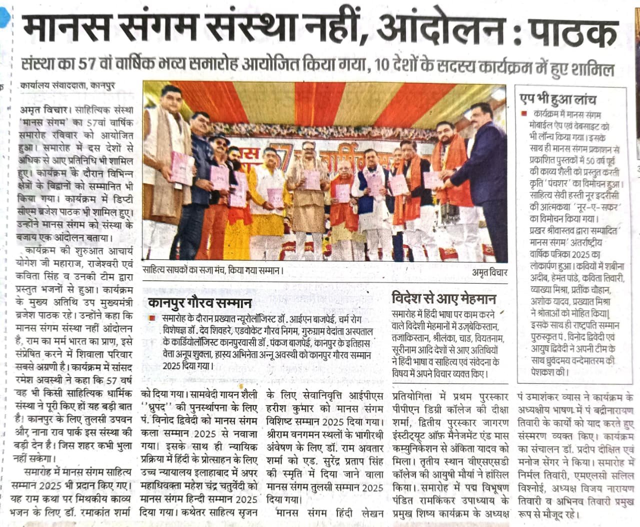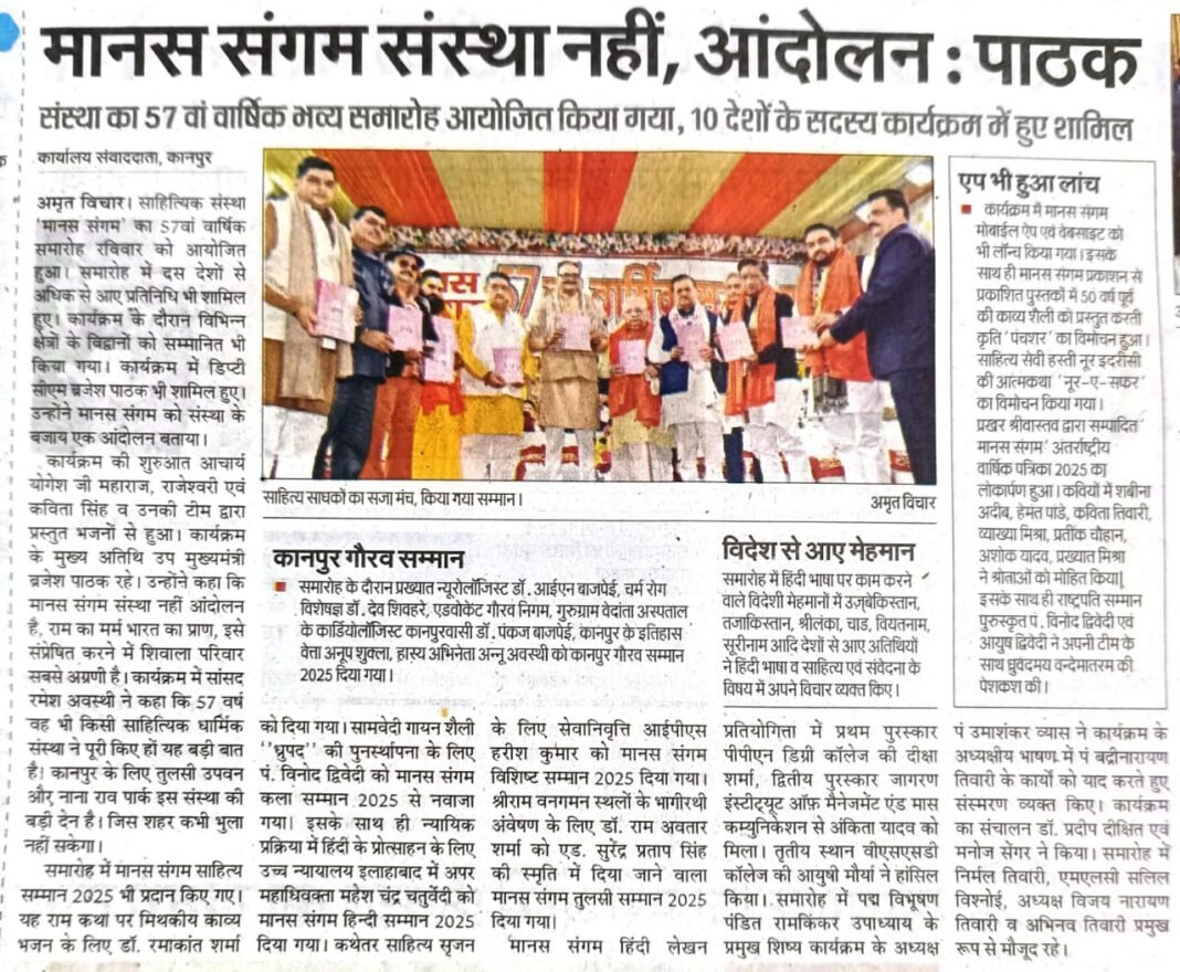 संस्थान समाचार संस्थान समाचार January 25, 2026 Updated: January 25, 2026 By Admin Share FacebookTwitterWhatsAppEmailPrintTelegram 13 अमृत विचार 29/12/25 Adminhttp://manassangam.com Share FacebookTwitterWhatsAppEmailPrintTelegram LEAVE A REPLY Cancel reply Comment: Please enter your comment! Name:* Please enter your name here Email:* You have entered an incorrect email address! Please enter your email address here Website: Save my name, email, and website in this browser for the next time I comment. Advertisement Latest news संस्थान समाचार संस्थान समाचार Admin - February 11, 2026 Uncategorized संस्थान समाचार Admin - February 11, 2026 कार्यक्रम साहित्यसेवी बद्रीनारायण जी की पुण्यतिथि पर आयोजित हुई विचारगोष्ठी Admin - February 10, 2026 संस्थान समाचार संस्थान समाचार Admin - January 25, 2026 अन्य खबरे संस्थान समाचार संस्थान समाचार Admin - February 11, 2026 Uncategorized संस्थान समाचार Admin - February 11, 2026 कार्यक्रम साहित्यसेवी बद्रीनारायण जी की पुण्यतिथि पर आयोजित हुई विचारगोष्ठी Admin - February 10, 2026 संस्थान समाचार संस्थान समाचार Admin - January 25, 2026