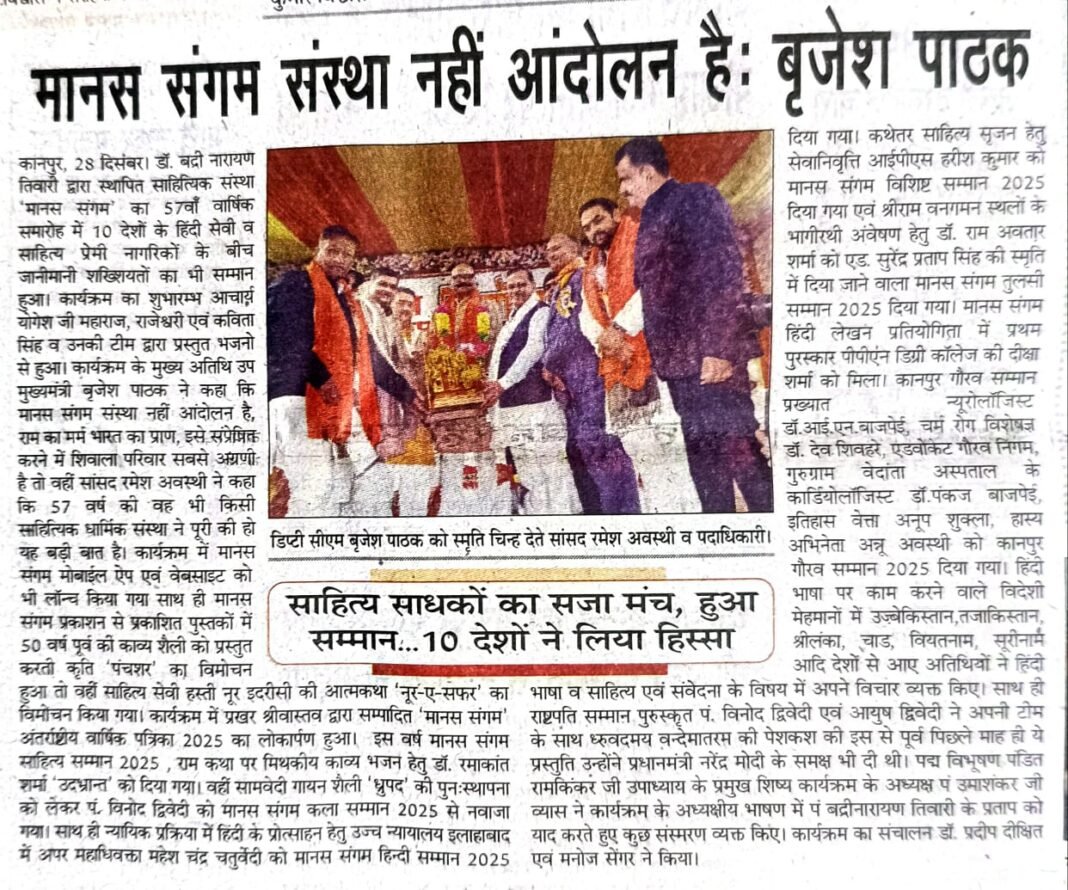 संस्थान समाचार संस्थान समाचार January 25, 2026 Updated: January 25, 2026 By Admin Share FacebookTwitterWhatsAppEmailPrintTelegram 10 राष्ट्रीय सहारा 29/12/25 Adminhttp://manassangam.com Share FacebookTwitterWhatsAppEmailPrintTelegram LEAVE A REPLY Cancel reply Comment: Please enter your comment! Name:* Please enter your name here Email:* You have entered an incorrect email address! Please enter your email address here Website: Save my name, email, and website in this browser for the next time I comment. Advertisement Latest news संस्थान समाचार संस्थान समाचार Admin - February 11, 2026 Uncategorized संस्थान समाचार Admin - February 11, 2026 कार्यक्रम साहित्यसेवी बद्रीनारायण जी की पुण्यतिथि पर आयोजित हुई विचारगोष्ठी Admin - February 10, 2026 संस्थान समाचार संस्थान समाचार Admin - January 25, 2026 अन्य खबरे संस्थान समाचार संस्थान समाचार Admin - February 11, 2026 Uncategorized संस्थान समाचार Admin - February 11, 2026 कार्यक्रम साहित्यसेवी बद्रीनारायण जी की पुण्यतिथि पर आयोजित हुई विचारगोष्ठी Admin - February 10, 2026 संस्थान समाचार संस्थान समाचार Admin - January 25, 2026